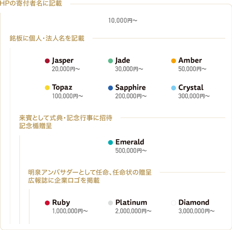 本学園では、個人様、法人様から高額のご寄付を賜った場合、寄付額に応じて名誉称号贈呈の対象としております。名誉称号の区分は次の通りです。