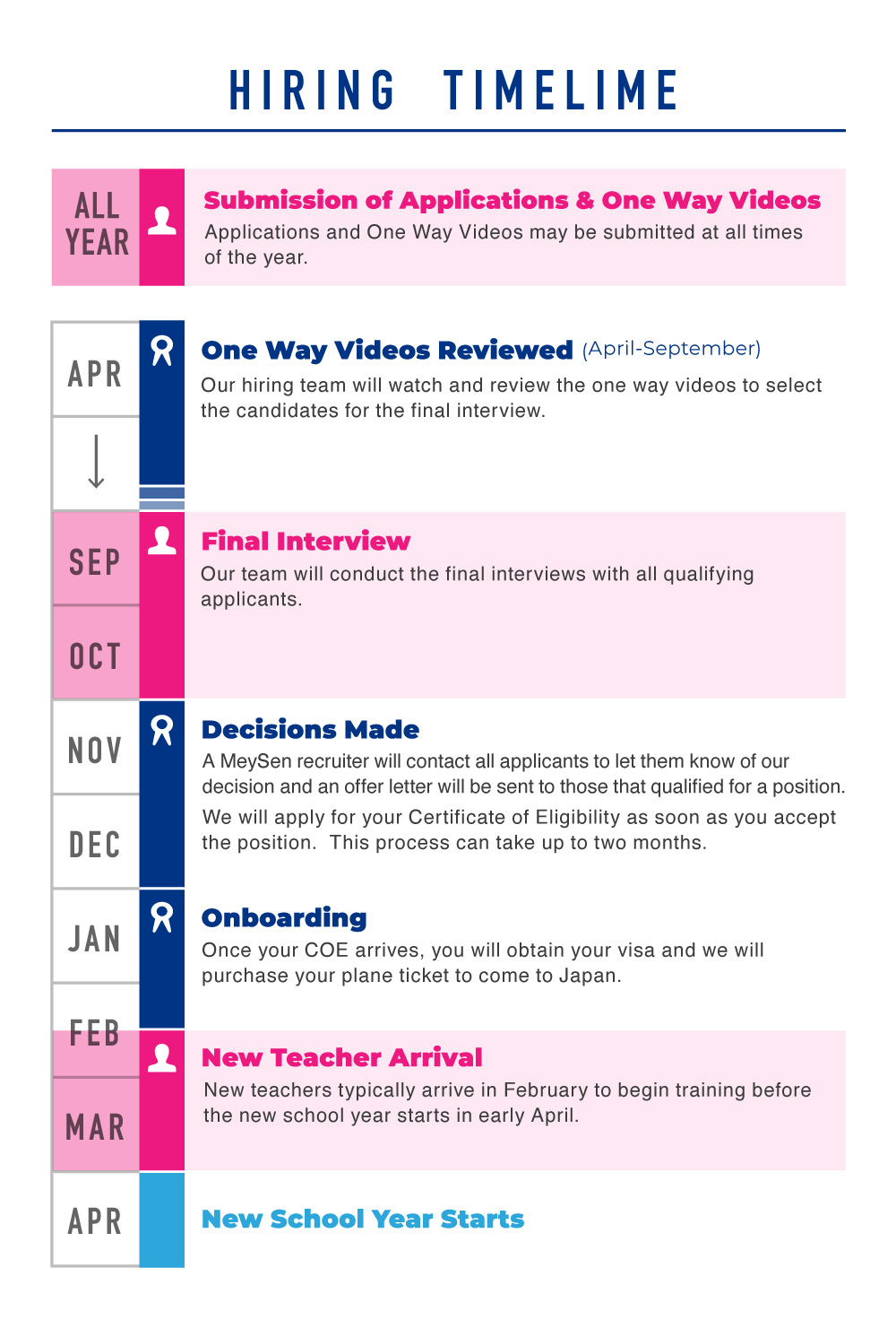 The team’s decisions are typically made within two weeks. Once the offer of employment is extended and accepted verbally, the new employee will begin working with the Human Resource and Foreign Staff Support Teams in gathering and completing the necessary paperwork for obtaining a work visa. The amount of time new employees are in this state of the on-boarding process varies by the time of year they are hired and their date of arrival in Japan.