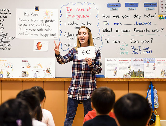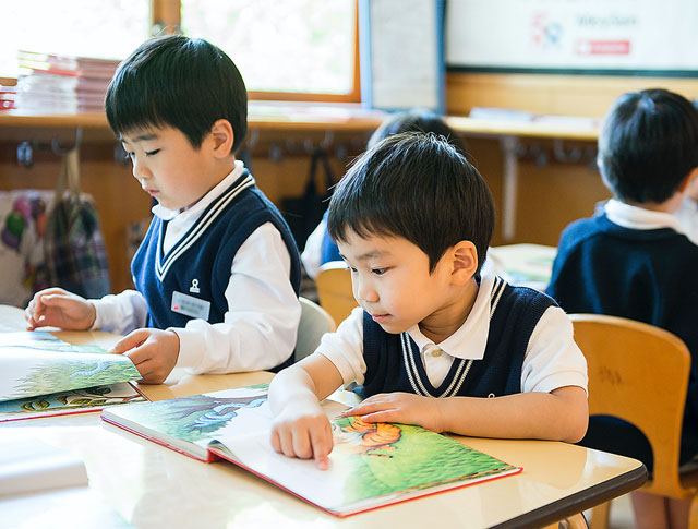 幼稚園の年中・年長では、毎日40分の英語保育の中で、英語の言葉に含まれる“音”を聞き分けながら、アルファベットの読み方・書き方を習得します。また、会話の基礎となる正しい表現を暗唱し、楽しいストーリーや歌、ポエム、踊りなどを通して、表現能力を育成します。そして卒園後に進むフレンドクラブでは、これらの力をさらに総合的に高め、実用的なコミュニケーションを可能にする英語力を培います。