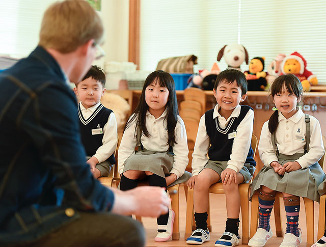 タドラークラスと年少でも、自然に英語に親しめるよう楽しい絵本教材などを用いながら、毎日10〜20分のネイティブ教員による英語保育を実施しています。